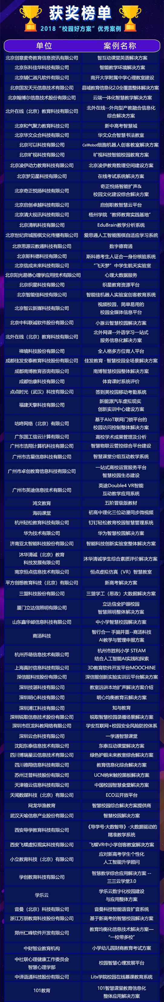 是不是按奈不住激動的內心了?本次將首輪公布“第五屆校園好方案”評選活動——“2018智慧教育優秀案例企業”榜單,內容如下,看看你上榜了嗎?