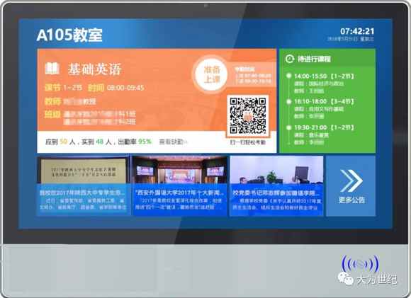 大為世紀電子班牌擁有專業(yè)性、安全性、交互性和獨立性的特點,其系統(tǒng)功能包括了多媒體展示、教務信息展示、教務考勤功能、問卷調查功能等。根據學校的需求,班牌可以展示班級信息、班主任信息、班級宣傳文化、班級活動照片、學校通知公告,同時可以導入或者對接學校的教務系統(tǒng),展示班級當日課程表、當前課程信息、出勤結果信息等。