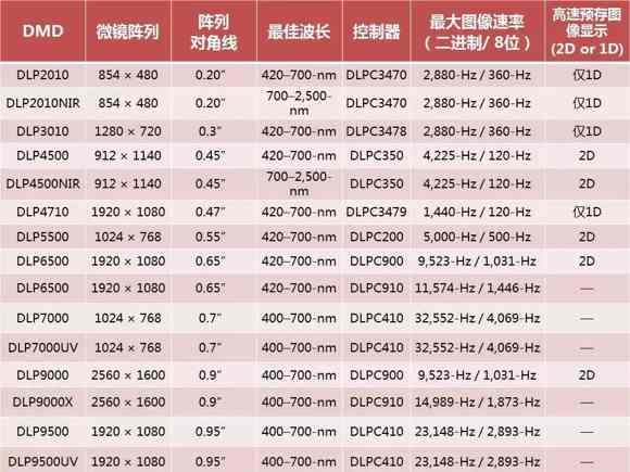 TI提供了一系列的DLP芯片組,以適應不同的3D掃描要求,如下表1所示。