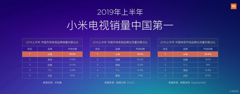 根據中怡康、奧維云網、群智咨詢三大調研機構統計,小米電視取得了2019上半年銷量中國第一的成績。基于小米在電視行業的6年雄厚經驗積累,Redmi 紅米電視一經推出,就站在巨人的肩膀上,為米粉提供又一優質可靠的選擇。