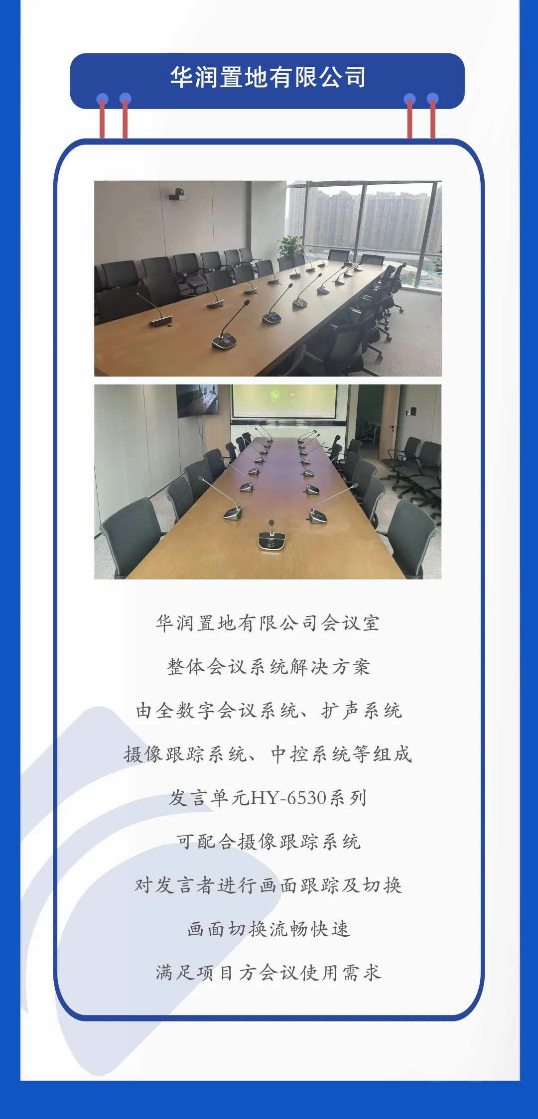 華音堅持以“專業專注、科技創新”為動力,公司擁有一批業內先進的科研人員,專業研發、生產。組建了聲學實驗室、音頻測試實驗室、無線射頻實驗室等專業機構,全面啟動高端全數字會議系統、可編程中央控制系統、信號切換系統、會議錄播系統、會議音響系統及周邊處理設備等產品研發、生產與銷售。 嚴格依據國際標準,在設計開發、采購、生產、品質管理和服務等過程中實施標準化管理和控制,產品全部采用先進的SMT貼片生產工藝。目前已擁有全數字會議系統、無紙化會議系統、交互分布式系統、2.4G無線會議系統、無咪桿陣列式會議系統、同聲傳譯系統、電子投票表決系統、視頻跟蹤系統、電子桌牌顯示系統、中央控制系統、矩陣切換系統、音頻擴聲系統等30多個品類,50多個產品型號。我們公司可提供從小型會議室到大型國際會議系統解決方案,也是全球領先的現代會議系統設備研發制造廠商。