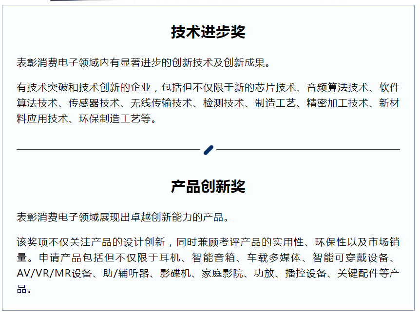 探索科技邊界,引領創(chuàng)新潮流!2025中國國際音頻產(chǎn)業(yè)大會除主旨論壇、專題論壇、快閃演講、展覽展示外,將推出2025年度“GAS消費電子科創(chuàng)獎”,包含“技術(shù)進步”獎及“產(chǎn)品創(chuàng)新”獎。是一個旨在推動消費電子行業(yè)技術(shù)進步和產(chǎn)品創(chuàng)新的重要獎項。